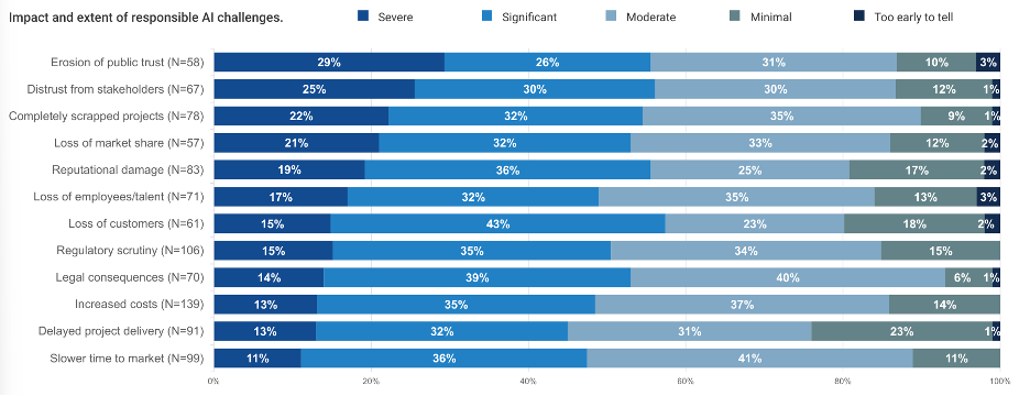 The companies surveyed are keenly aware that underperforming in being responsible in AI is already having negative impacts on brand reputation, increased customer skepticism, and abandonment of future projects – all of which undercut the potential of AI.